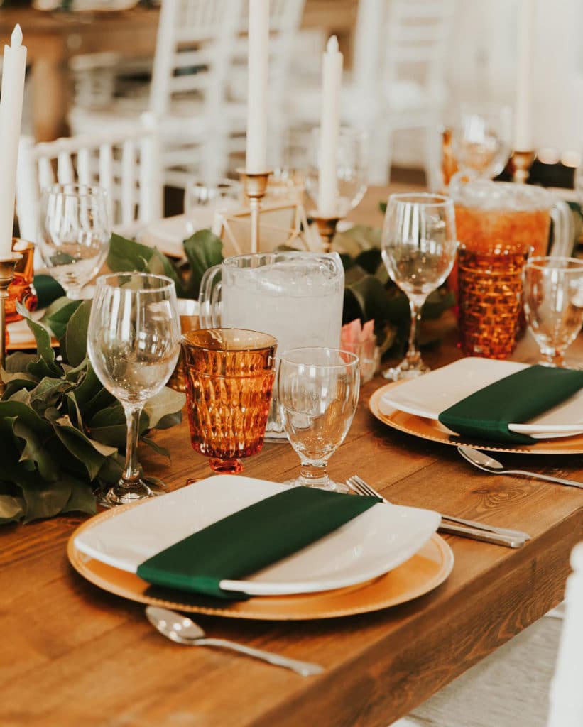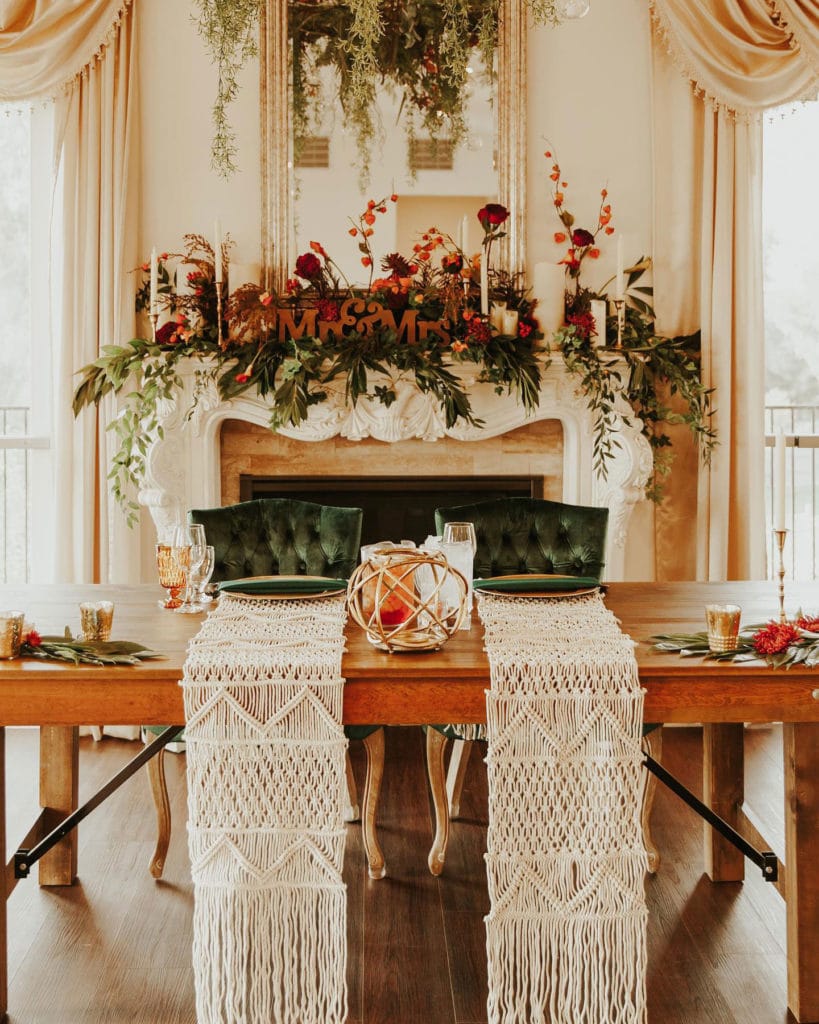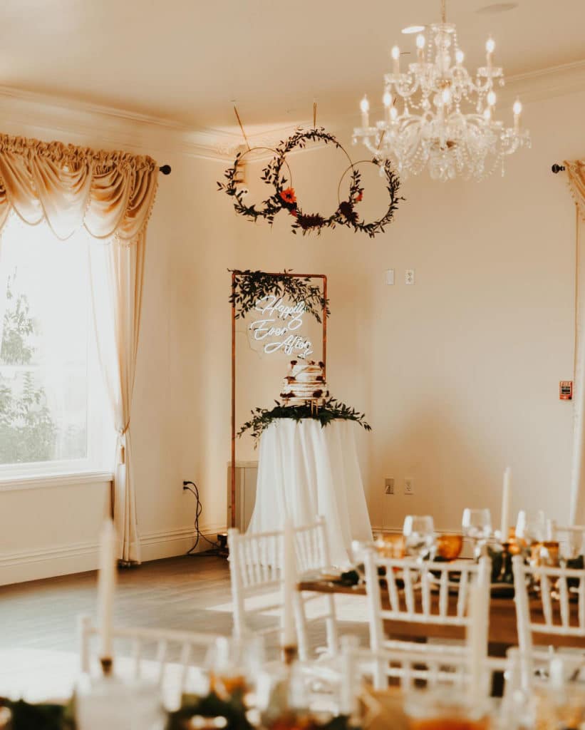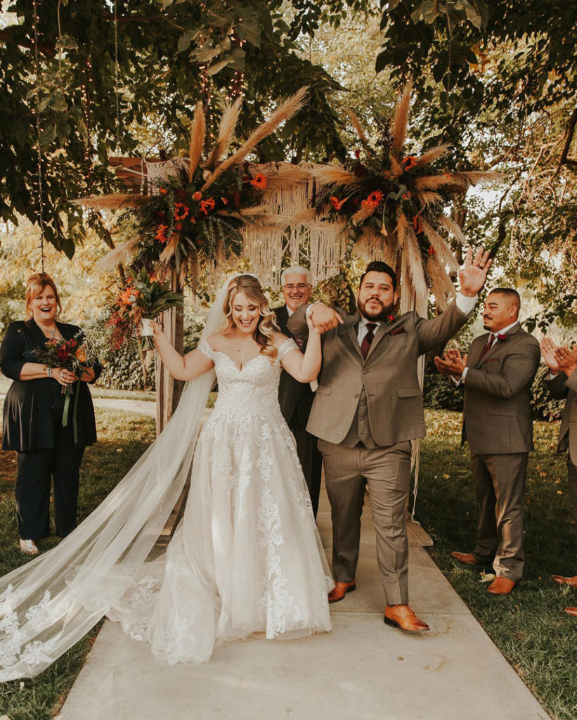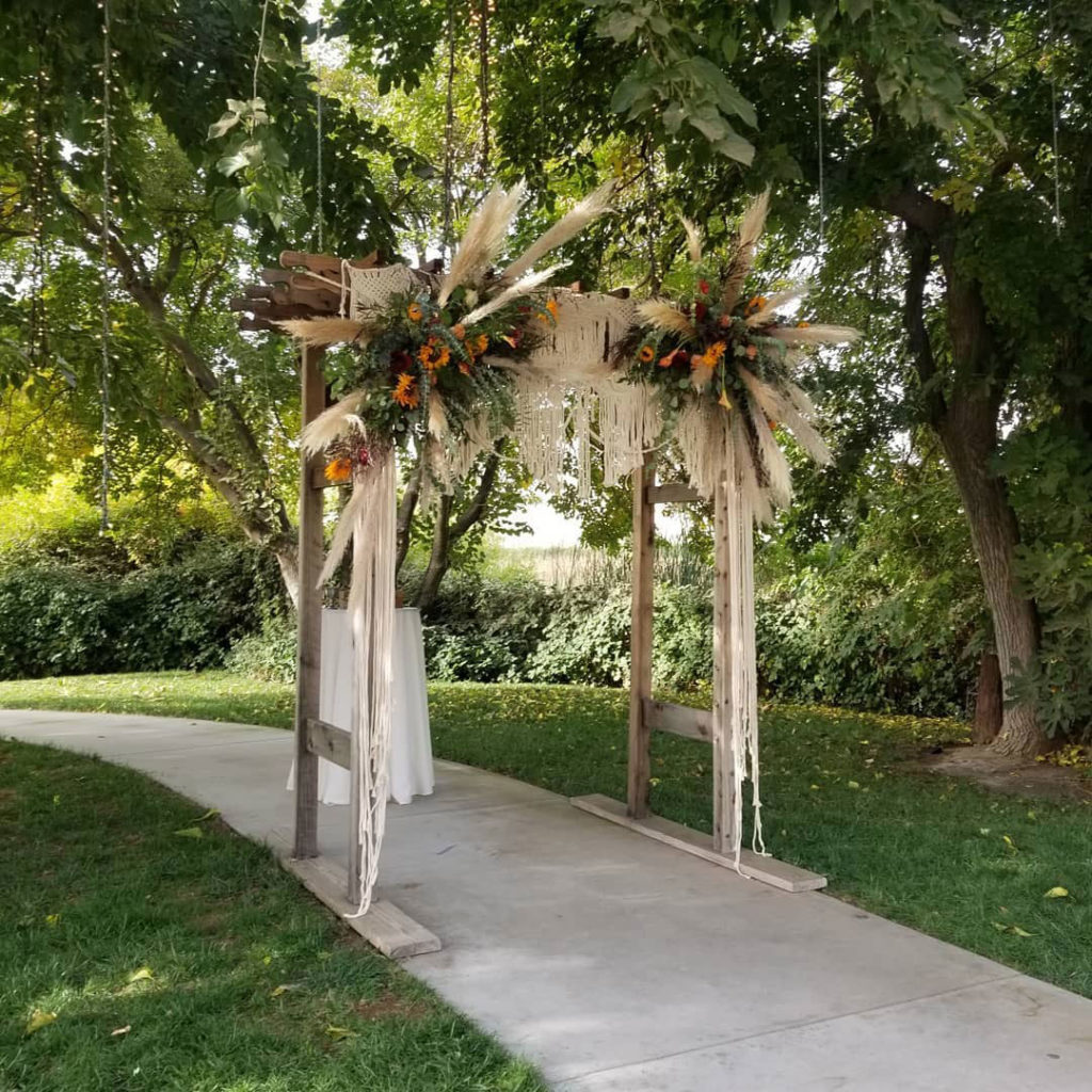 This October wedding was full of fun and trendy designs. We incorporated macramé at the ceremony by hanging it on a natural wooden arbor and then we added pampas grass along with all of the vibrant fall colors the couple chose for their wedding palate. At the reception we added macramé runners to the sweet heart farm table which complimented the green velvet chairs perfectly. The bride chose amber goblets for all of the guest tables and also added a copper stand with our “Happily Ever After” neon sign. It was the perfect fall evening! Congratulations Alyssa and Paul!!