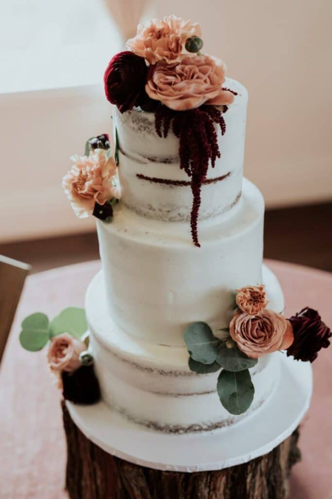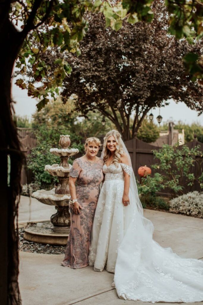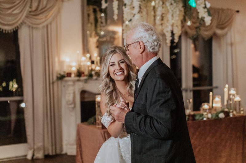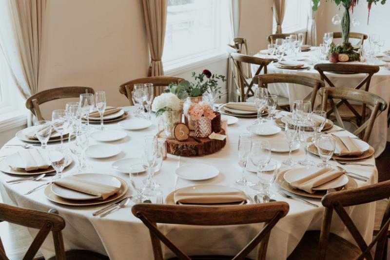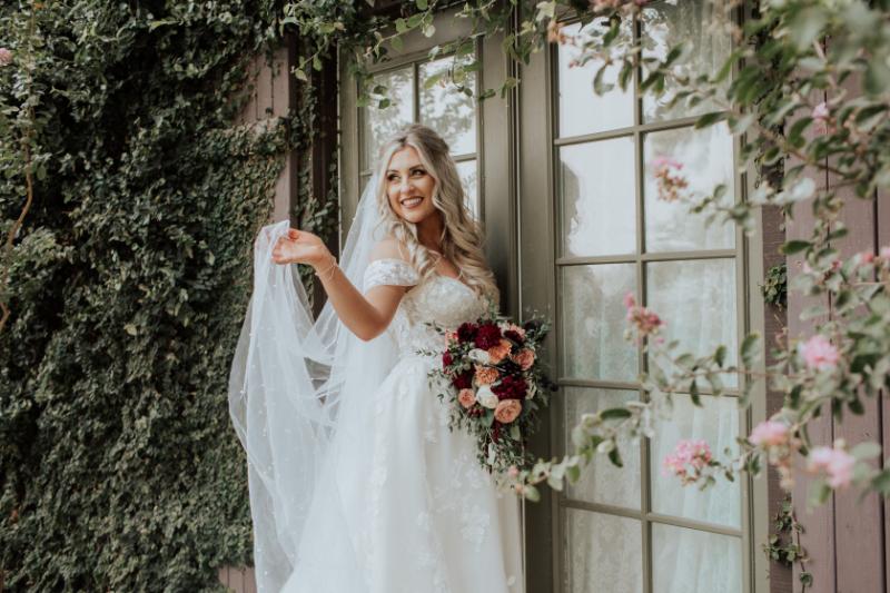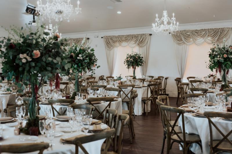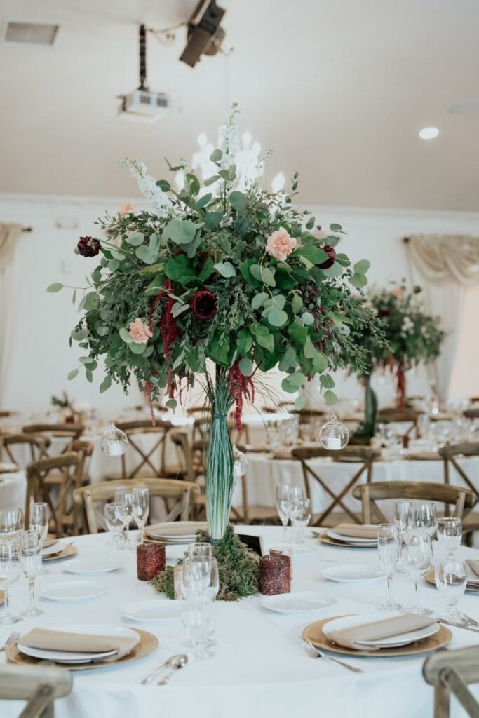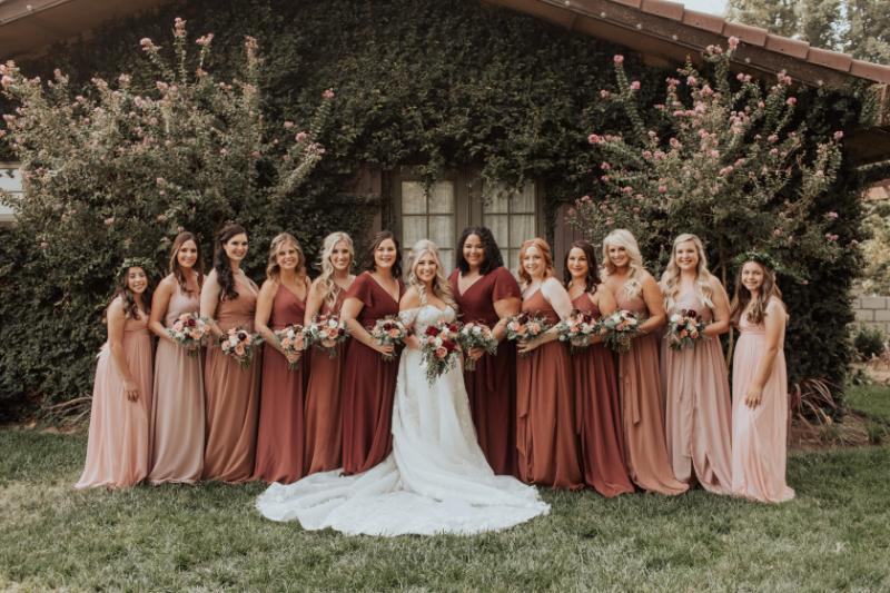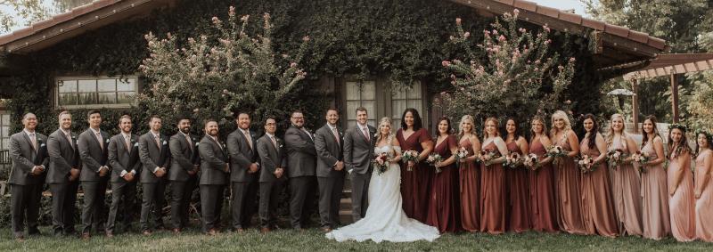 Sydney and Dean chose a warm gradient color palette for their wedding décor and wedding party. The colors of the bridesmaid gowns flowed from garnet jewel tones to mauve and blush tones, which led into soft terra cotta tones. Perfection! The groomsmen wore dark gray suits which were a great compliment to all the colors of the gowns! We were able to match our fresh floral designs to their gradient color palette by using burgundy dahlias, hypericum berries, roses like Cappuccino, and Black Bacarra, and several different greens for texture. We added dusty rose chiffon fabric to the floral arch at their outdoor ceremony. To bring the outdoors into the Grand Ballroom, tree-inspired centerpieces with floating orbs and candles adorned the guest tables. Using wooden cross-back chairs throughout the room added stylish charm and completed the look. It was a great day! Congratulations to the newlyweds!